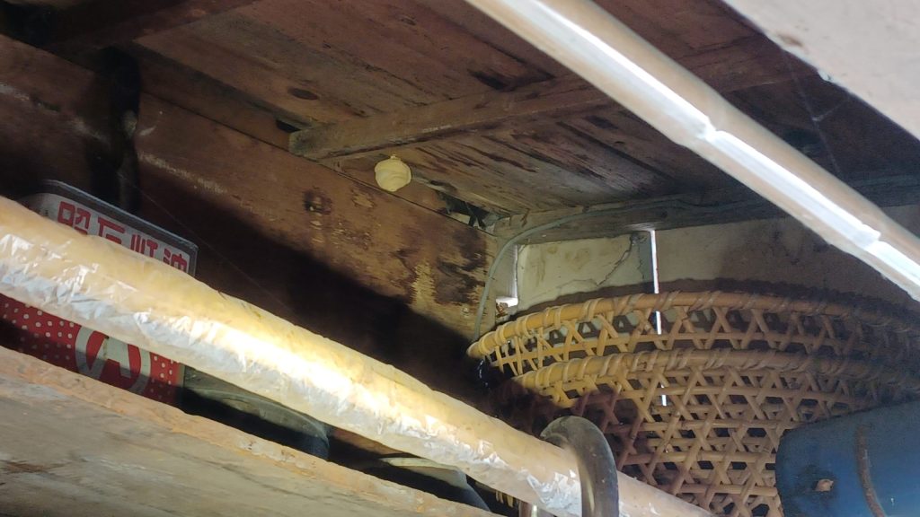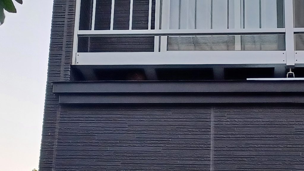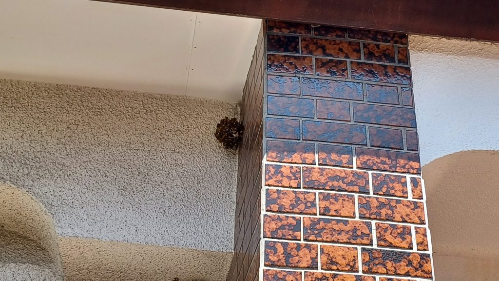 少し見づらいですが、ベランダ下の空間に作られたスズメバチの巣。